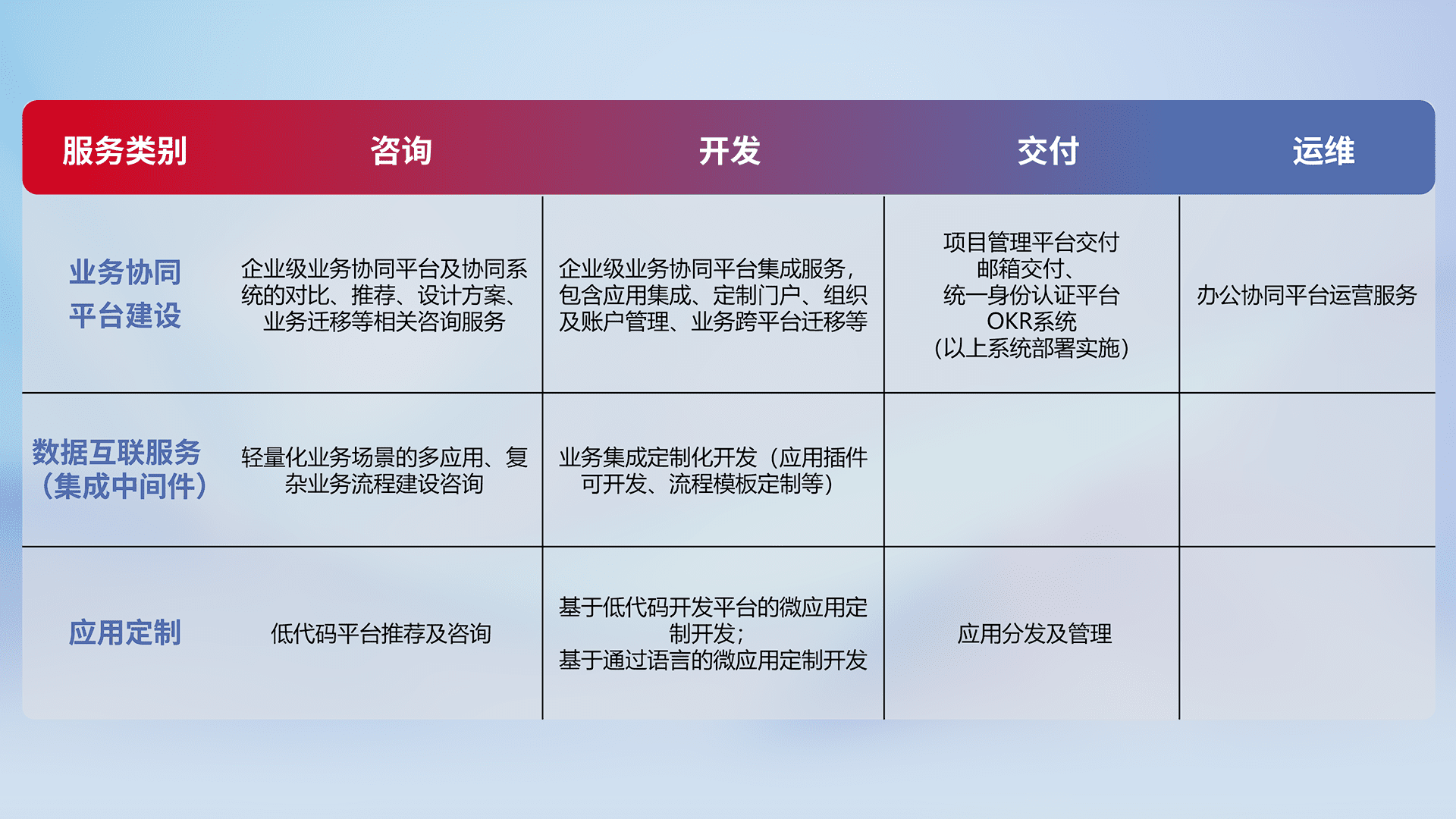 针对钉钉、、、企微、、IDaas等平台级产品提供产品的规划、、、、方案、、、、交付、、定制化开发等服务,,,实现如统一协同办公、、、智能客户服务、、混合会议管理、、、智能数据查询、、、、等业务场景,,,,实现数字化转型。。